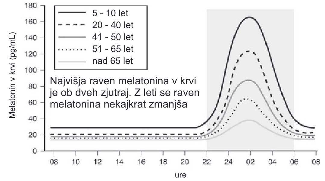 Ko pride druga polovica srednjih let in tretje življenjsko obdobje, številni ugotavljajo, kako pomembna je noč za vse, kar počnemo in kar se nam dogaja. Vključno in zlasti, ko gre za zdravje. Osrednjo vlogo pri tem ima melatonin, snov, ki jo tvori žleza češarika v možganih. Melatoninu pravijo kronobiotik, ta izraz hoče povedati, da nam uravnava in vodi dnevnonočne bioritme, poskrbi za izmenjavanje budnosti in spanja. Začne se tvoriti in izločati v temi, zvečer ko gremo spat. Ponoči doseže tudi svoj vrh in nato se raven melatonina do jutra zmanjšuje. Ko se pojavi dnevna svetloba, so ravni melatonina v krvi nizke. Poljudno pravimo, da gre za hormon spanja. Medicina v zadnjih desetletjih odkriva še številne in izjemne druge naloge, ki jih v telesu opravlja melatonin, na primer kot najmočnejši antioksidant, danes ostanimo pri tem, da je melatonin v navezi na naše dnevnonočne bioritme in s tem na spanje.